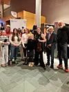 Fekk møte: I pausen fekk elevane høve til å helsa på fiolin-virtuosen. Eit naturlig treffpunkt var ved Sonoko-statuen i foajeen i Oseana. Der dukka også kunstnaren Arne Mæland og kunst-velgjerar Christian Rieber opp.