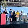 Bergen Matfestival: Landbruks- og matminister Geir Pollestad (f.v.) var ein av prisutdelarane, vidare statssekretær Even T. Sagebakken frå nærings- og fiskeridepartmentet, prisvinnar Dag Lygre, fylkesvaraordfører Stian Davies, prosjektleder i Matarena Ingerid Wembstad, dagleg leiar i Matarena Alexandra K. Angell, og ordførar i Bergen, Marit Warncke.