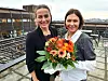 Blomar på takterrassen: Generalsekretær i Kreftforeininga, Ingrid Stenstadvold Ross, gratulerer Anette Hjartåker med midlane.Terje Mosnesset (Kreftforeningen)