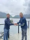 Stolt: – Eg er så stolt over den gjengen som arbeider hos oss, frå merdkanten til teiknebrettet, seier dagleg leiar Sondre Eide. Prisen vart delt ut av nestleiar i Venstre, Sveinung Rotevatn, fredag ettermiddag.