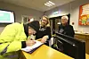Etter å ha fullført føremiddagsoppdraget får Erlingen godkjentstempel av Sonja Haugland og Aina Haugland. Dei to i kundetorget på rådhuset er strålande nøgde med sitt trufaste og humørfylte bod.