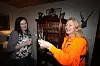 Line Solberg Tombre og Tina Skudal beundrar vinglasa som er funne i brukthallen på gjenvinningsstasjonen. Vitrineskapet i bakgrunnen er også henta i brukthallen.
