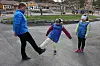 Klem på koronavis: Rektor Olav Røttingen og tredjeklassing Andrea Olsen Fergevåg syner korleis ein kan klemma kvarandre på koronavis. Julie Marie Steensen til høgre i biletet.Camilla Kvamme