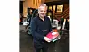 Glad bidragsytar belønna: Bjarte Skåtun og kollegaane hans på Agnar Skåtun trelast var blant dei mange som fekk nybakt ostekake på døra av Brøddamo torsdag.Privat foto