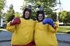 Medan born ifører seg sumodraktene utan blygsel, er vaksne reddare for å dumma seg ut.- Men fleire har ymta frampå om at dei vil leiga utstyret heim i hagen, fortel Benjamin Bruarøy (t.v.) og Thomas Marceliussen.