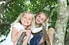 Louise Dysvik-Johansen (5) (t.v.) og Nora Hjelmeland Hjelmervik (5) finn seg godt til rette i eit av trea utanfor Fusa skule, der dei har første skuledag i dag.