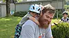 Stornøgd: Trebarnsfar Mads Kleivane er stornøgd med den nye pumptrackbanen i Eikelandsosen. I bakgrunnen står Isak (5), medan Adam (3) heng kring halsen på pappa.Anne Marie Aarøen Vangsnes