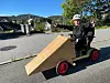 Testa farten: Ein stolt Johannes Bakervik var ute og testa farten med sin nye Olabil i Skeisheia torsdag ettermiddag. 10-åringen sit som ein konge med ein ombygd kontorstol som førarsete.