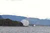 Sett frå Solstrand: Det var ikkje stort anna enn røyk ein kunne sjå frå mottaket på Solstrand. Bak holmane var store ressursar på plass, etter at meldinga om brann i fritidsbåt kom inn torsdag formiddag.