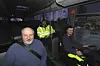 Yrkessjåfør-elevane Morten Hellevik (ved rattet) og Martin Ivar Risøy Kristoffersen fekk prøva seg som bussjåførar for første gong onsdag. Lærar Harry Bjørkhaug rettleia dei gjennom bussturen frå skulen til Kysthospitalet og tilbake.