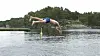 Kaster Aarø (12) let seg ikkje hindre av den kjølige vinden når han stupar uti sjøen på Kallneset. - Det er mykje varmare i sjøen enn på land, meinar han.