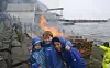 Simen Brekke, Kristoffer Brekke og Sasja Melbø var godt kledde for kvelden, men fann det likevel godt å varma seg litt på sankthansbålet i Mobergsvikjo.Alle foto Kenneth Svenningsen