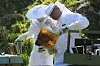 Sjekkar forholda: Ein bikube består nesten utelukkande av ei dronning, og døtrene hennar, arbeidarbiene. I tillegg finst det eit par hundre dronar (hannbier). Her ser Erik Walden og Reidar Berg til at biene har det bra.