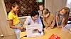 Konsentrerte: Karoline Hjelle syner dei unge «lærlingane» korleis glidelåsen i brilleetuia skal festast. Frå venstre: Selene Kleppe, Hjelle, Nova og Luna Tyssøy Folgerø-Holen og Vårin Inasdatter Sirevåg.
