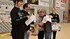 Brits Ildsjelfond: Haakon Groth-Bugge fekk ein god klem av mangeårig gutelags-trenar Brit Tungeland. Bak til høgre står Nora-Sofie Kvernes Skåtøy, og til venstre er styreleiar Hege Engelsen og leiar i Os handball, Christian Bugge.
