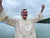 Her har soknepresten nettopp hoppa på sjøen. I prestekjole.